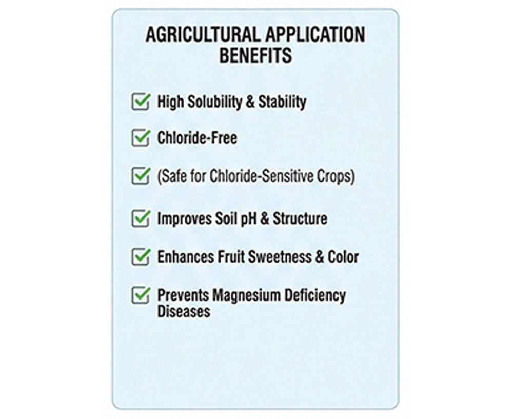 Q3: Is Magnesium Sulfate safe for all crops? A3: Yes, it is particularly beneficial because it is chlorine-free, making it safe for chlorine-sensitive crops like tobacco, potatoes, and grapes.