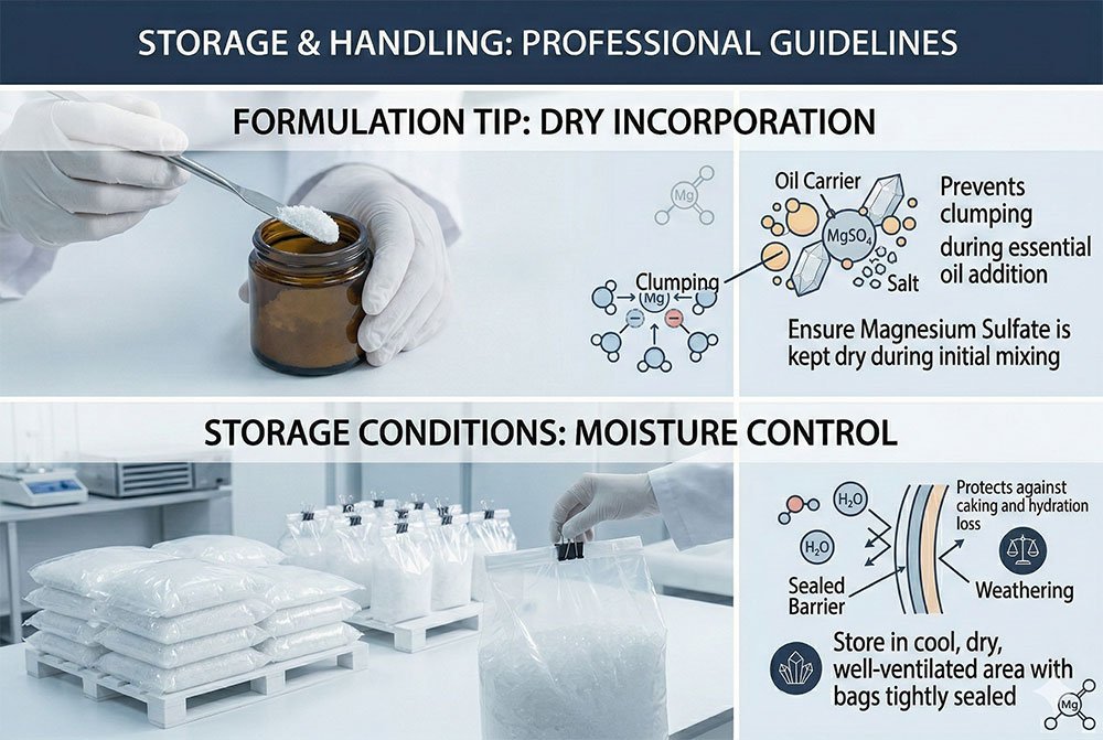 Moisture Control: Always store MgSO4·7H2O in a dry environment. Exposure to air can cause the salt to lose its hydration water, changing its texture.