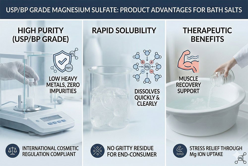 For professional skincare and bath products, manufacturers must source Epsom salt wholesale for cosmetics that meets USP (United States Pharmacopeia) or BP standards.