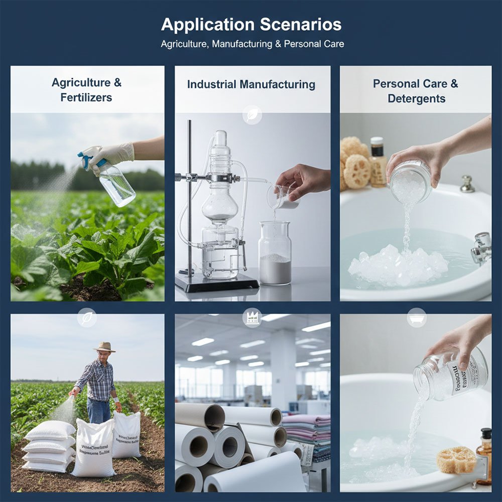 - Heptahydrate: Known as “Epsom Salt,” it is the gold standard for bath salts and cosmetic formulations due to its skin-friendly crystal structure.