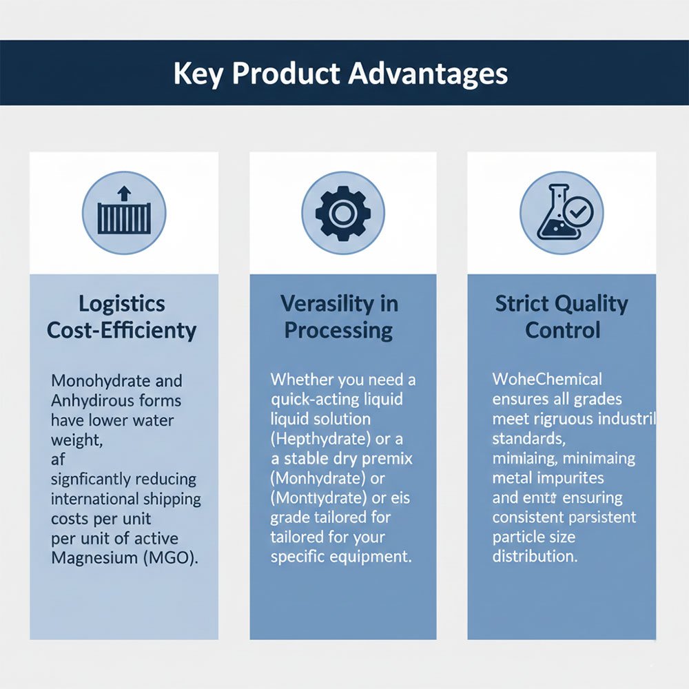 Logistics Cost-Efficiency: Monohydrate and Anhydrous forms have lower water weight, significantly reducing international shipping costs per unit of active Magnesium (MgO) compared to Heptahydrate.