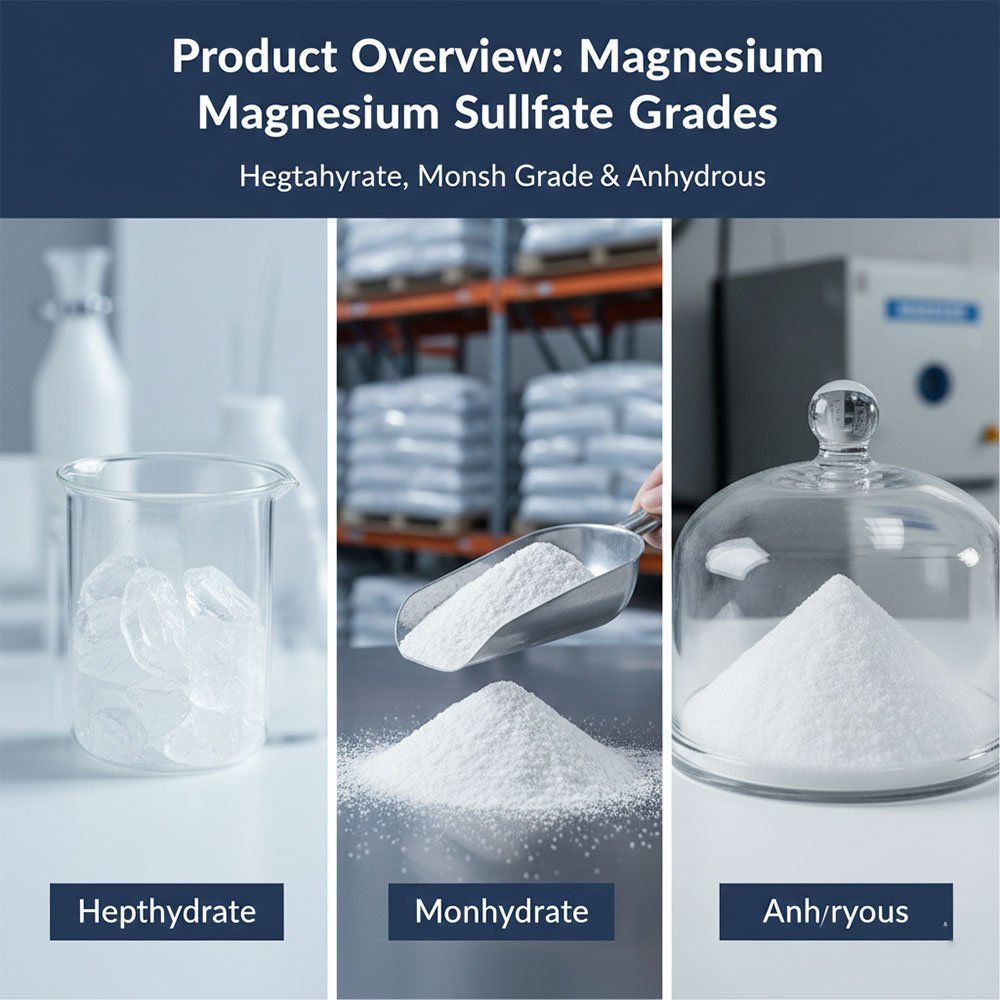 Magnesium Sulfate (MgSO4) is a versatile inorganic salt widely used across agriculture, industry, and pharmaceuticals. However, choosing between its different hydration states—Heptahydrate (MgSO4·7H2O), Monohydrate (MgSO4·H2O), and Anhydrous (MgSO4)—is critical for production efficiency. These variants differ primarily in their water content, which directly impacts their magnesium concentration, solubility, and physical stability.